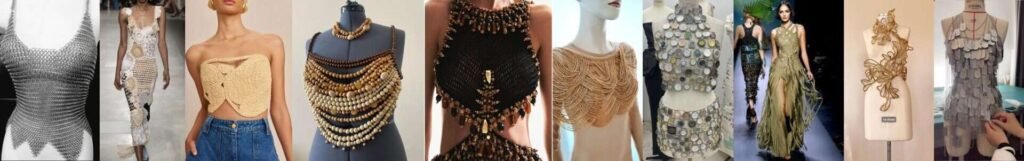 • Recycled fabrics (PET, wool, sequins), deadstock, vintage embellishments.